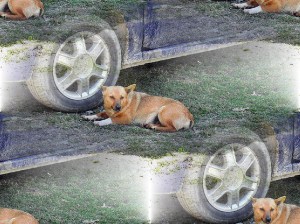 Mașina e cam nespălată,dar nu contează pentru cățel.Umbră să țină.